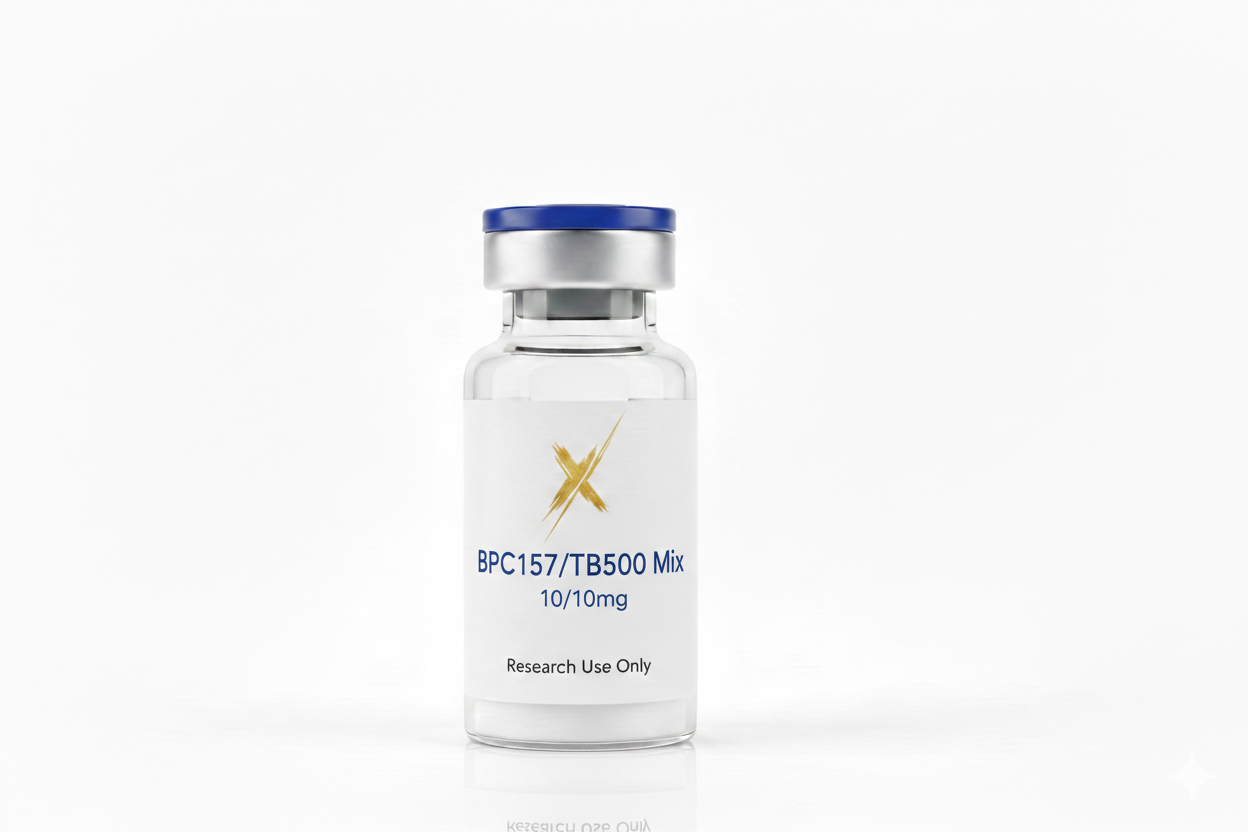 The BPC-157 / TB-500 Mix is a specialized formulation combining two prominent research peptides. BPC-157 is a synthetic 15-amino acid pentadecapeptide, while TB-500 is a synthetic fraction of the naturally occurring actin-sequestering protein, Thymosin Beta-4. In molecular biology, this combination is utilized to study synergistic mechanisms of cellular migration, structural integrity, and extracellular matrix (ECM) remodeling.